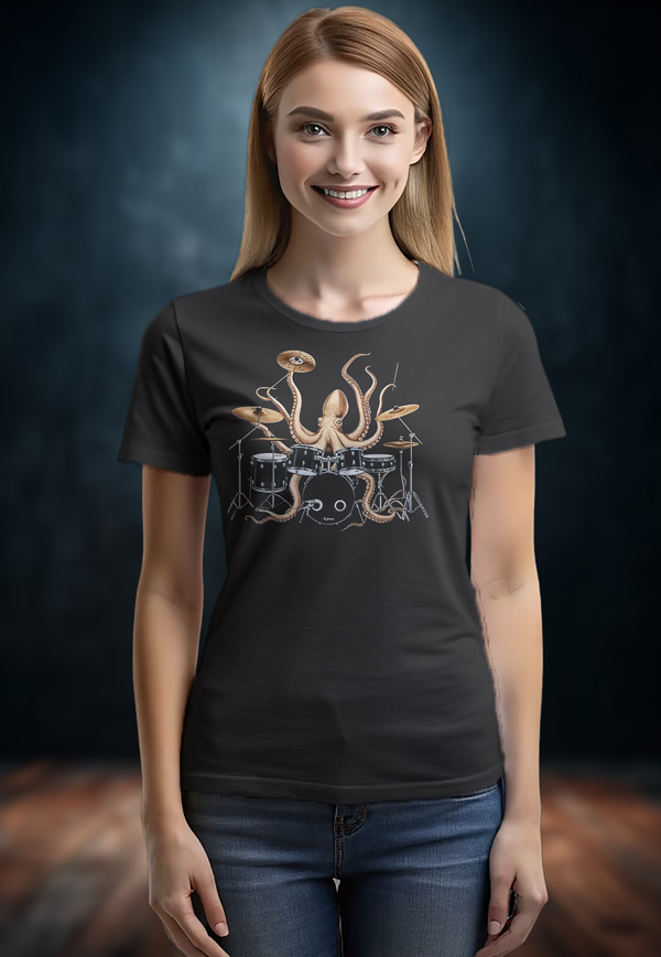 Дамска тениска с  рисунка на  Октопод барабанист в арт стил за истински барабани.