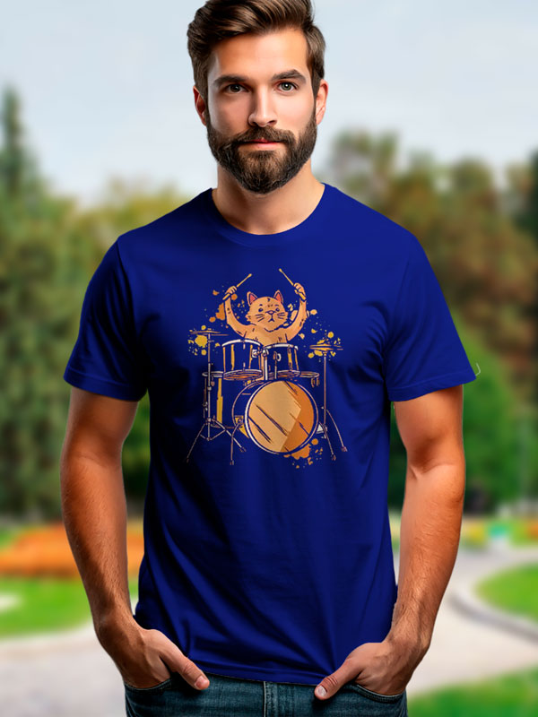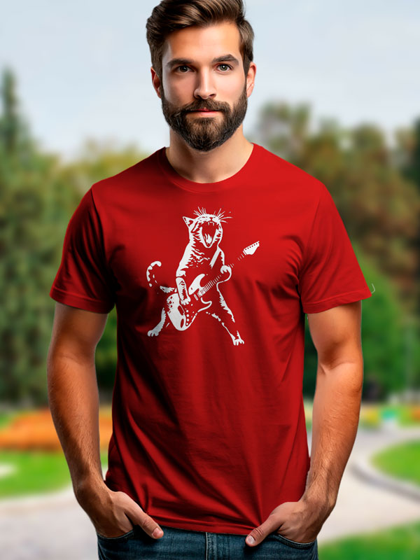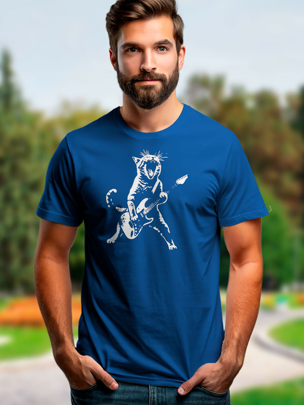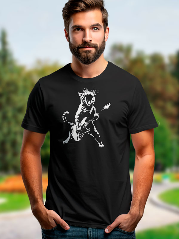 Мъжка тениска с изображение на коте с китара в арт стил.